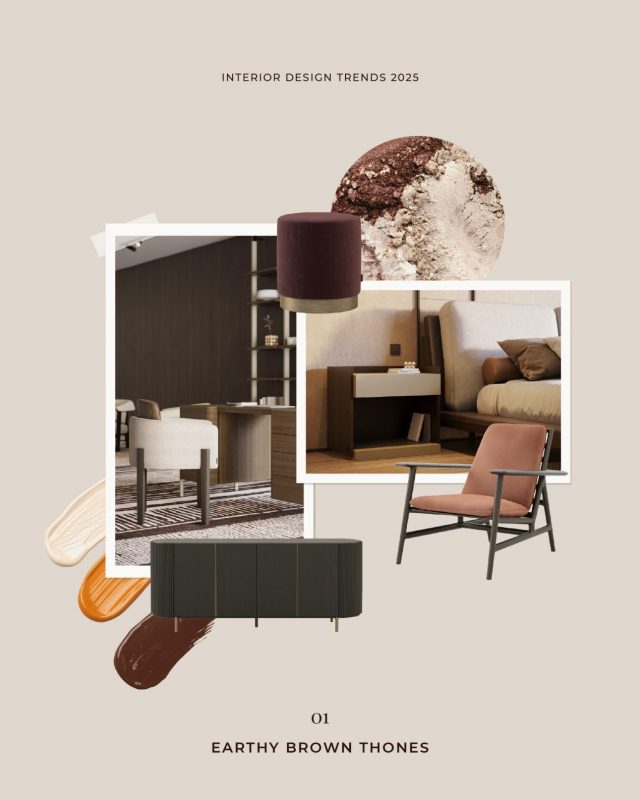- Ζεστά γήινα χρώματα: τερακότα, κεραμιδί, άμμος και βαθύ μπεζ δημιουργούν μια αίσθηση γαλήνης και σταθερότητας.